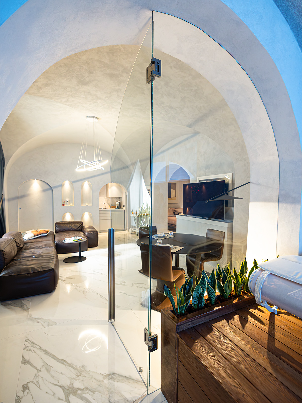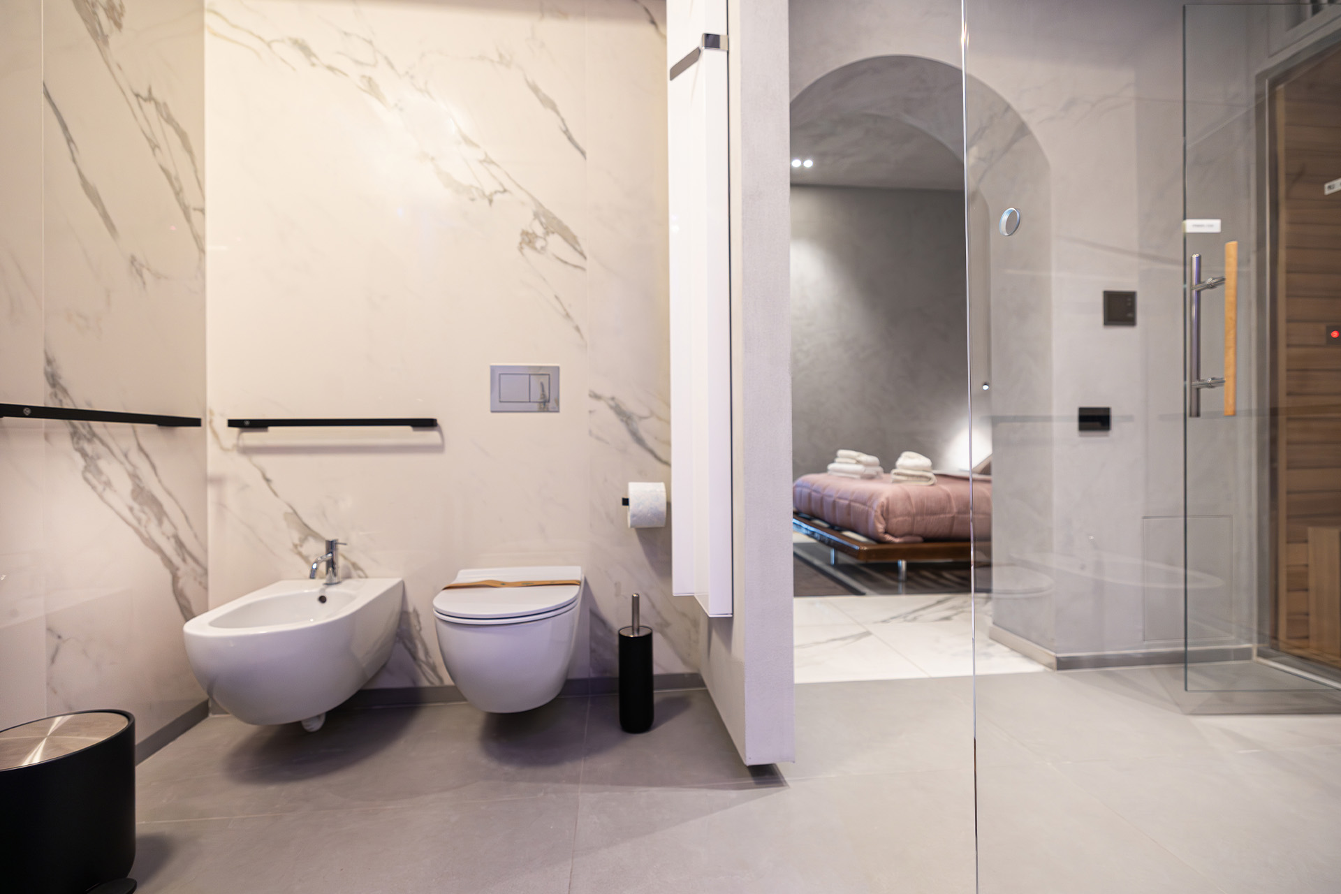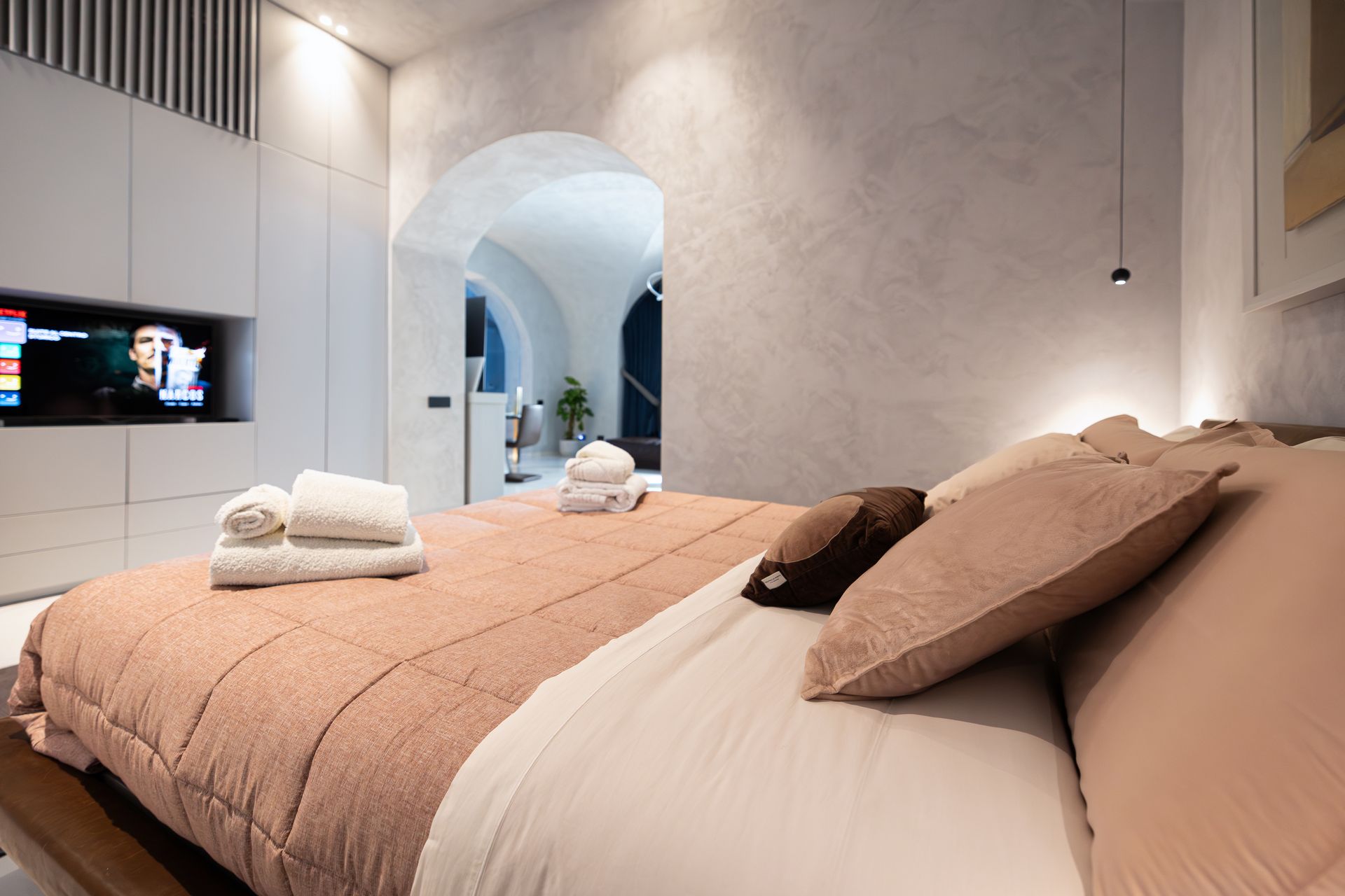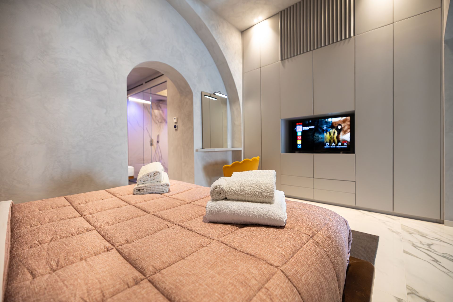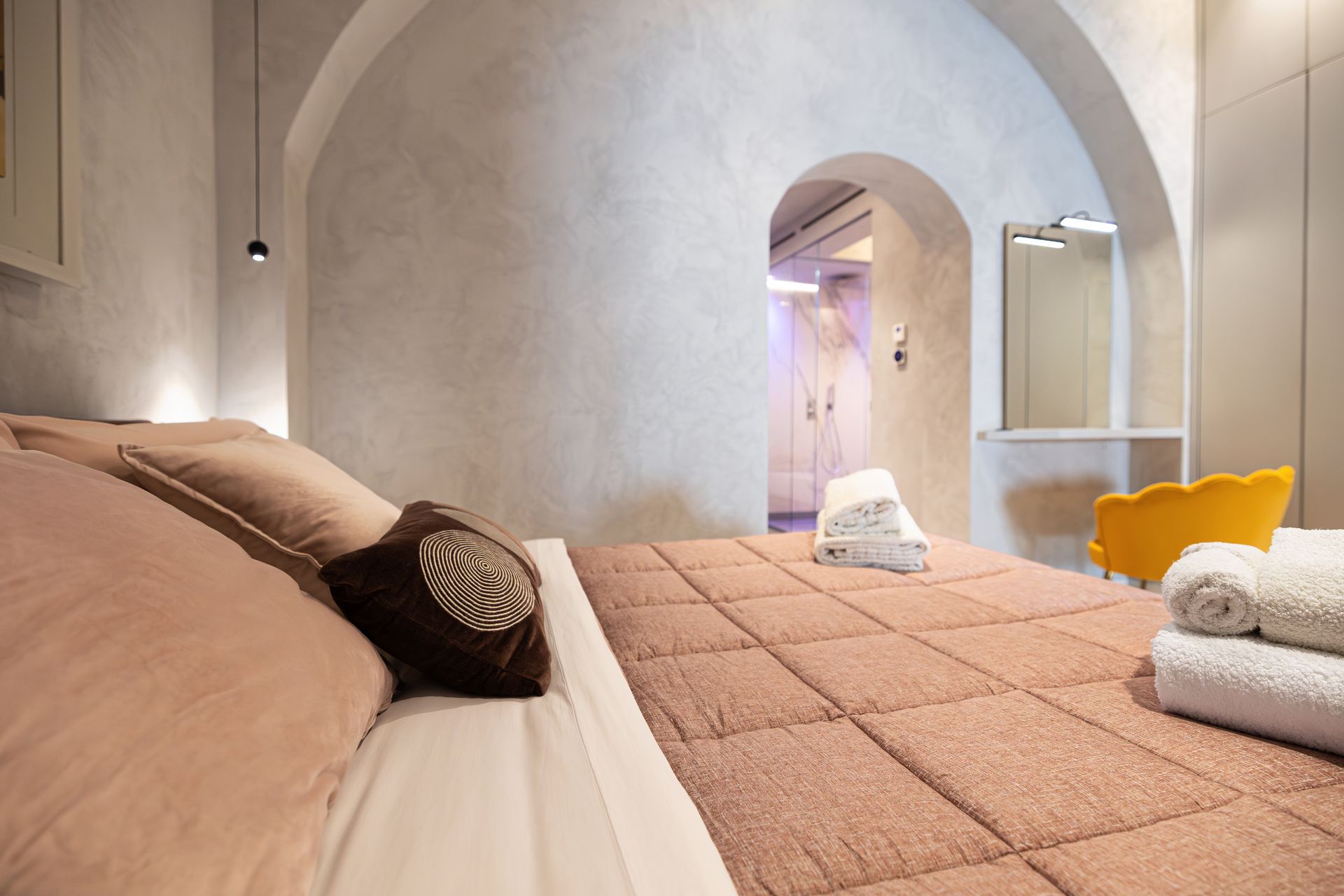 Suite al Centro Storico è un rifugio di 110 mq pensato per chi cerca spazio, stile e privacy. Ogni ambiente è progettato per offrire un’esperienza sensoriale completa, grazie alla luce dorata che riscalda l’ambiente, ai materiali scelti con cura e a un design che invita subito al relax.