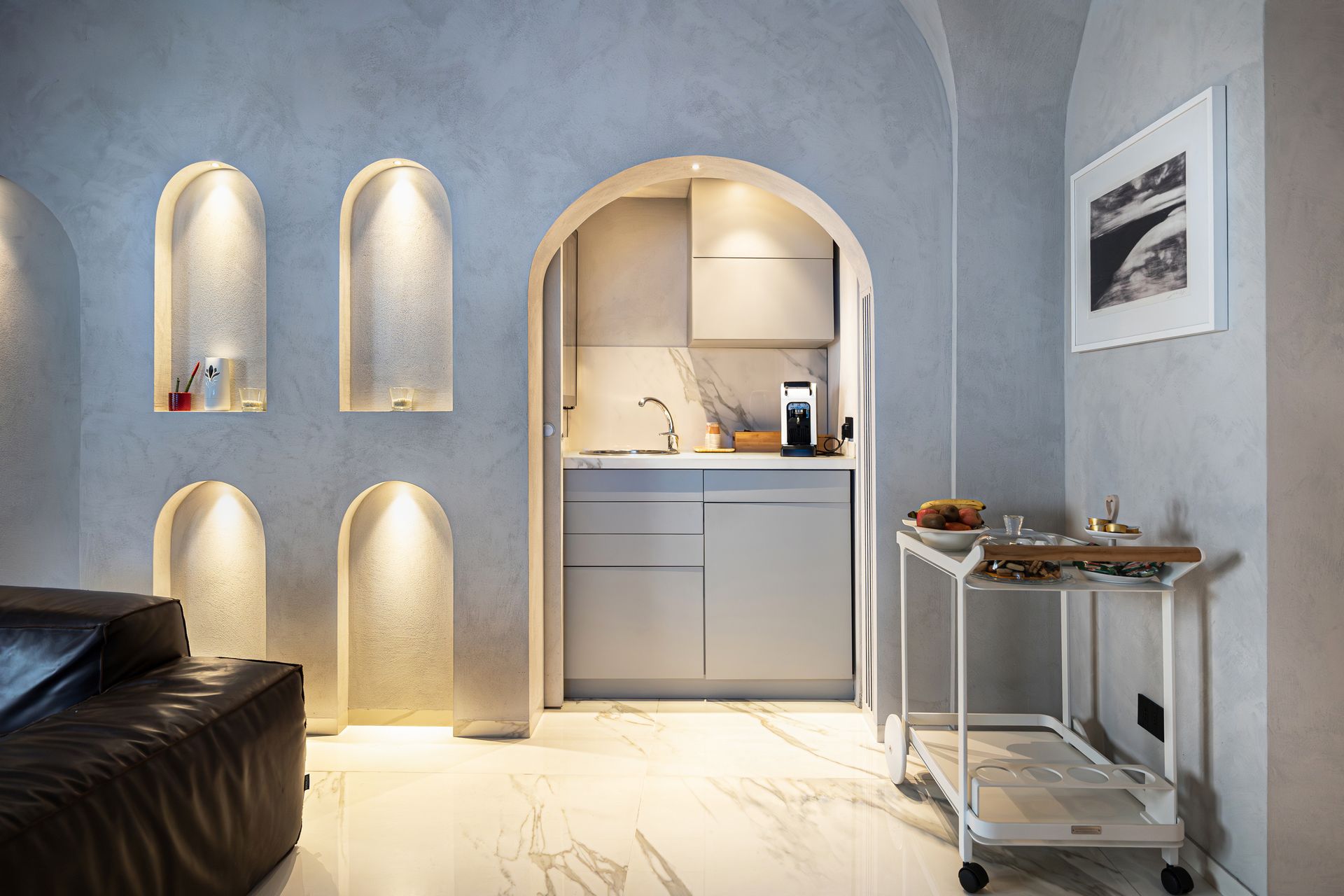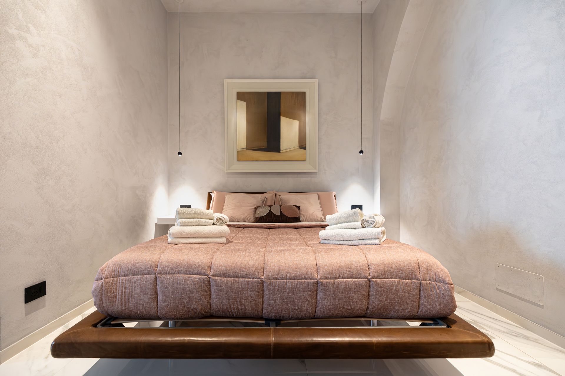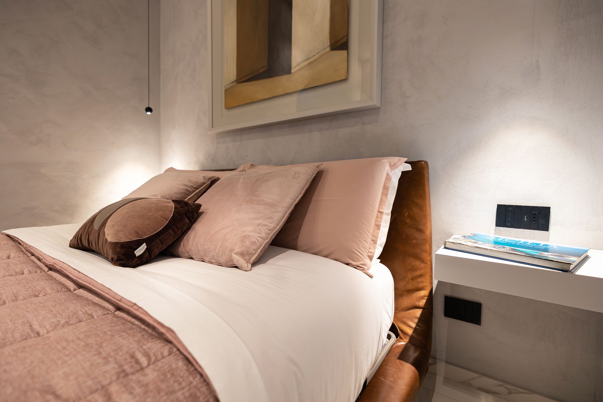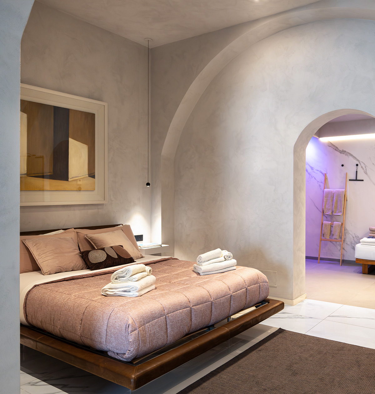 Elegante e minimalista, con letto sospeso, luci soffuse e colori per un'atmosfera intima.