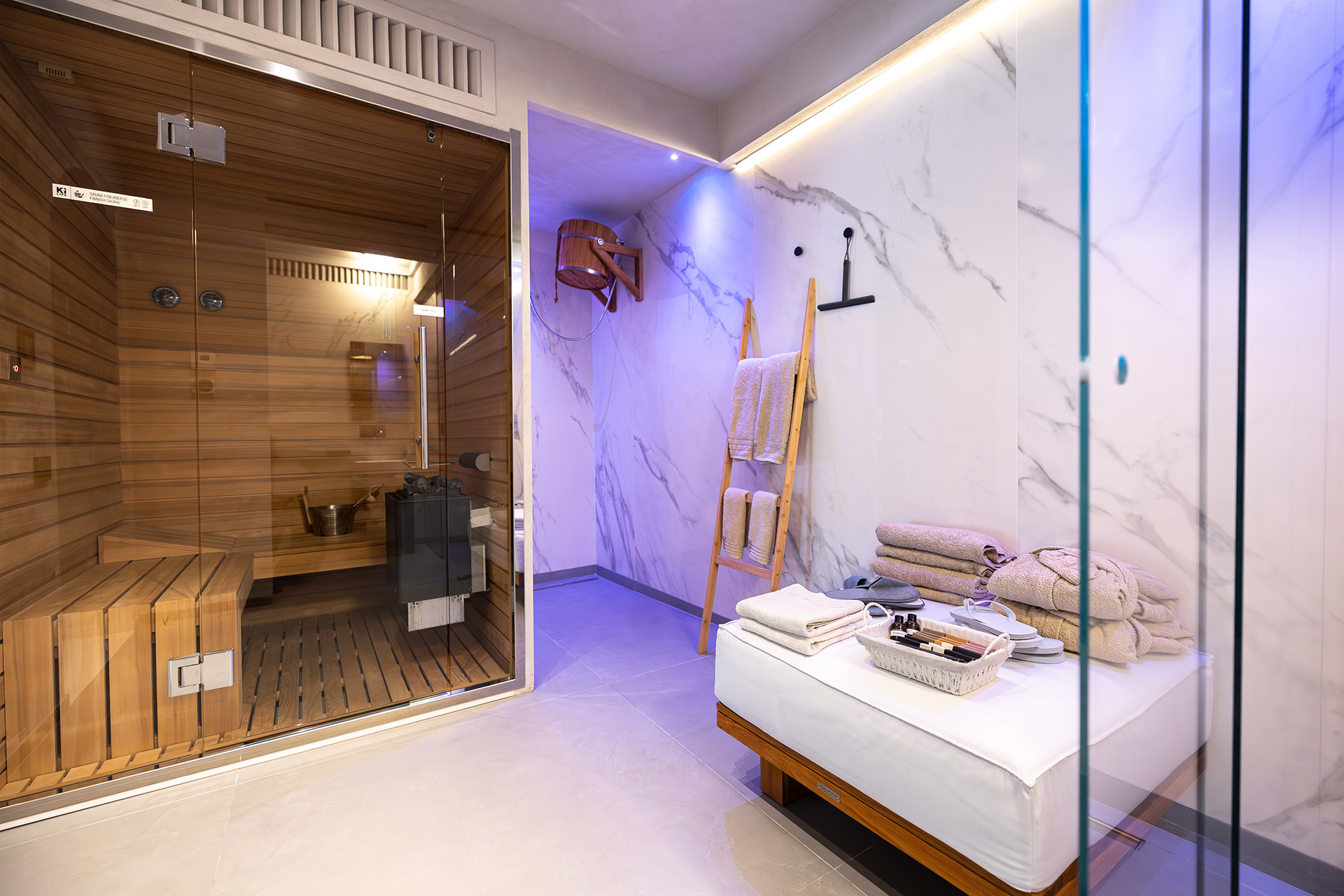 Sauna, idromassaggio e doccia emozionale: un rifugio di design per rigenerare corpo e mente.